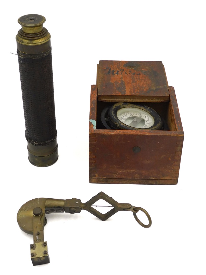 19th C. To include: (A) Three-draw telescope with cap. Brass with woven wrap. 8 3/8″ to 23 1/2″ long. (B) Boxed dry compass. 3 1/4″ high x 4 1/4″ wide x 4 3/4″ deep. (C) Palmer reflecting clinometer. 6 3/4″ long. Condition consistent with age and use.