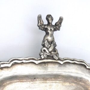 19th century. A rectangular tray with two handles with what appears to be a woman being swallowed by a fish. Possibly mermaids. Possibly a Hindu motif. Scalloped edge and animal paw feet. Unmarked. Tested as sterling silver. 1 1/8″ high x 17″ wide with handles x 6 1/2″ deep. 32.19 ozt. Monogrammed in center. Shows light surface scratches and age appropriate wear. Provenance: From the estate of Alan Gaines of A & A Gaines Antiques, Newport, Rhode Island. Shipping Restriction: Please note this lot must be paid for by cash, wire transfer or known check. Items will be shipped or sent to shipper once payment clears.