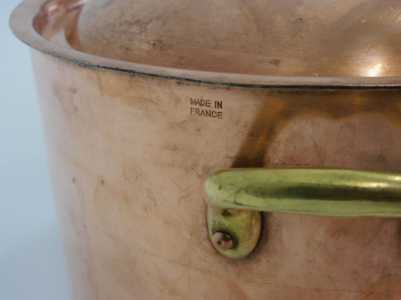 (6) Vintage French copper cocottes or dutch ovens with lids. (4) round and (2) oval. The smallest round cocotte is 2 1/2″ high without lid, 4 7/8″ diameter, stamped Made in France, 1 lb without lid. Knob finial. Surface scratches. Discoloration and minor staining throughout. The next largest is hammered on the bottom. Stamped Havard, Made in France. 3″ high without lid, 6 3/8″ diameter, 1.6 lbs without lid. Brass handles. Copper showing on bottom. Minor dents. Surface scratches and staining. The next largest is hammered on the bottom. Stamped Havard, Made in France. 3 7/8″ high without lid, 7 7/8″ diameter. 2.87 lbs without lid. Surface scratches and staining. The largest round cocotte is stamped Made in France. 5″ high without lid, 10″ diameter. 5.41 lbs without lid. Surface scratches and staining. The smaller oval cocotte is stamped on the bottom Made in France. 4″ high without lid, 6 1/2″ wide, 9 1/2″ long. 3.44 lbs without lid. Surface scratches and staining. The larger oval cocotte is hammered and unmarked. 4 7/8″ high without lid, 8 3/4″ wide, 12″ long. 5.14 lbs without lid. Surface scratches and staining.